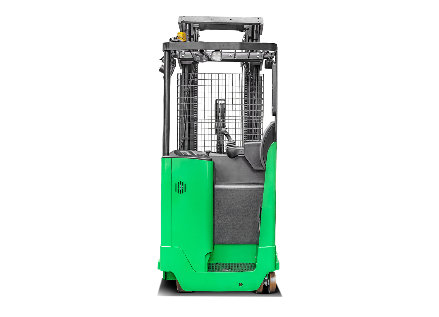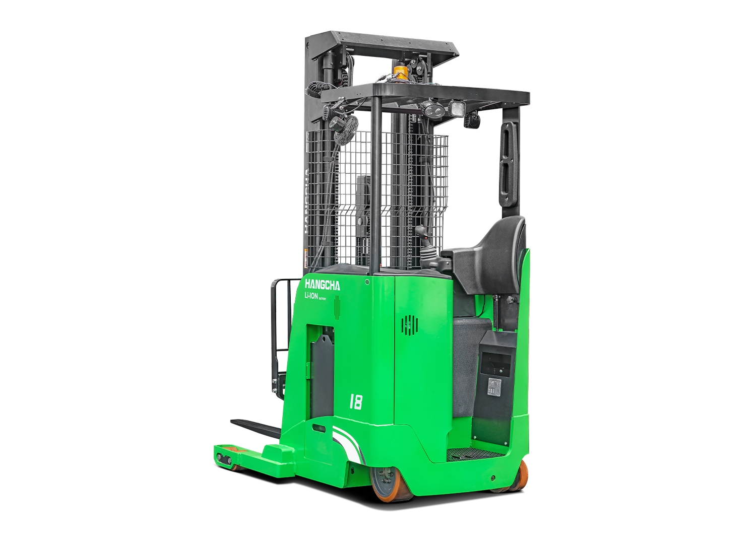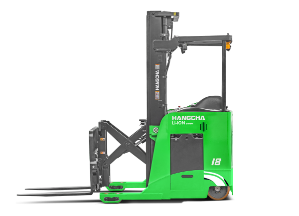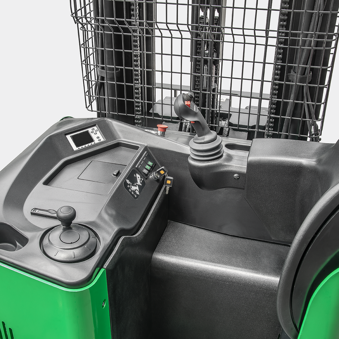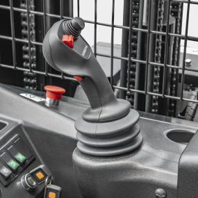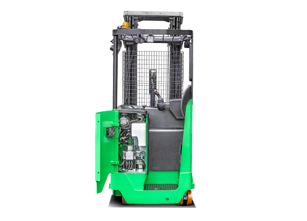 La estructura de cuatro puntos de pivote, el bajo centro de gravedad y la alta resistencia de los componentes principales del marco están diseñados para resistir la capacidad de carga máxima del montacargas. El controlador, los conectores, el enchufe de la batería y el interruptor de corte son todas partes de proveedores reconocidos en la industria para garantizar confiabilidad, rendimiento y facilidad de servicio. La transmisión ZF, el motor de tracción SCHABMULLER y el eficiente sistema de energía AC mejoran considerablemente la confiabilidad y vida útil del montacargas de pasillo angosto. El controlador manipula el ángulo de dirección, la altura de elevación y la velocidad de desplazamiento del montacargas de manera coordinada para proporcionar operaciones más seguras. La forma única y el diseño inclinado del mango de control multifunción ayudan a minimizar el movimiento de la mano y la fatiga muscular. Con el sistema de detección de pedal, el montacargas solo puede ser conducido si el conductor está parado en el pedal. Si el operador retira el pie del pedal, se activa el frenado activo para prevenir un accidente. El mástil de tres etapas de elevación total libre proporciona una gran visibilidad para el operador y mejora la seguridad de las operaciones.