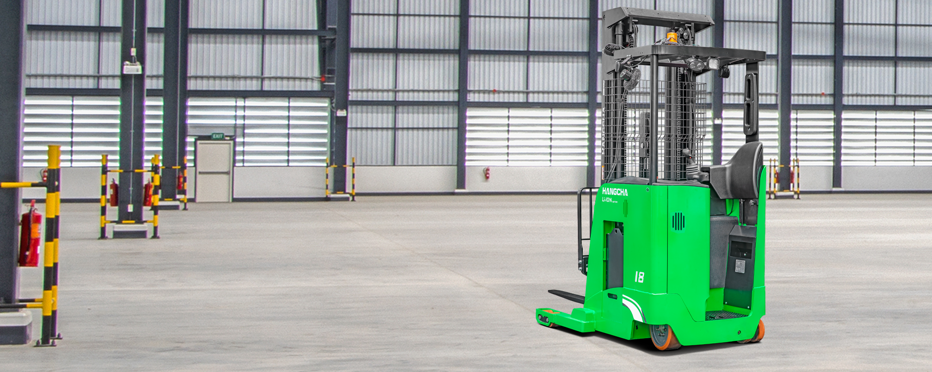 El montacargas retráctil de un solo pantógrafo y pasillo estrecho de la serie X con batería de litio está diseñado para apilar y recoger mercancías de manera eficiente en almacenes estrechos y a grandes alturas de elevación, manteniendo una capacidad de elevación de hasta 4,500 libras. El exterior de este montacargas está recubierto con un acabado en polvo duradero y fácil de ver en color verde, que lo identifica como un modelo con batería de litio.