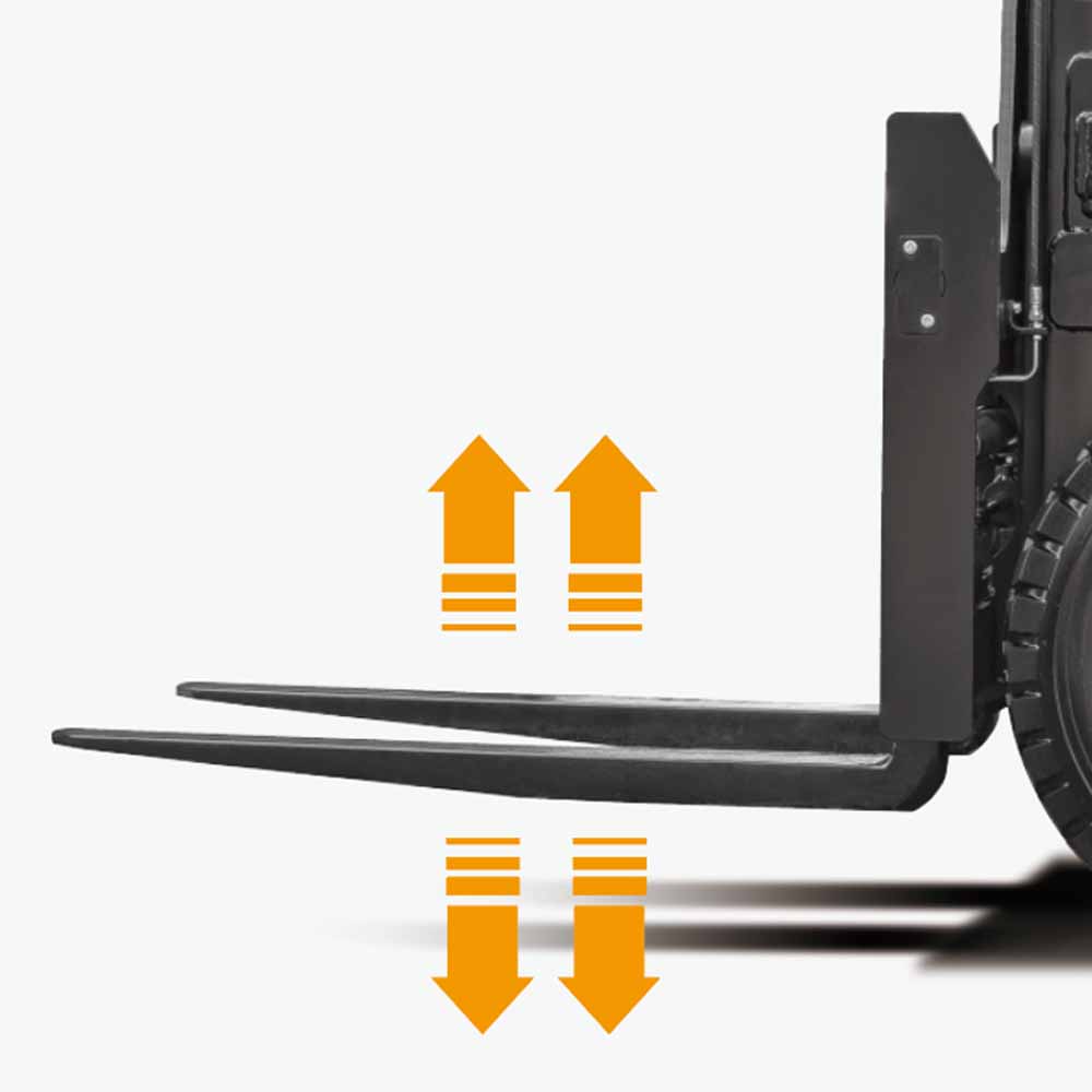 La configuración estándar proporciona una función de amortiguación para el descenso de la horquilla. Además, se ofrece una función de control electrónico opcional para amortiguar el ascenso de la horquilla para proteger la carga de caídas y daños al suelo.